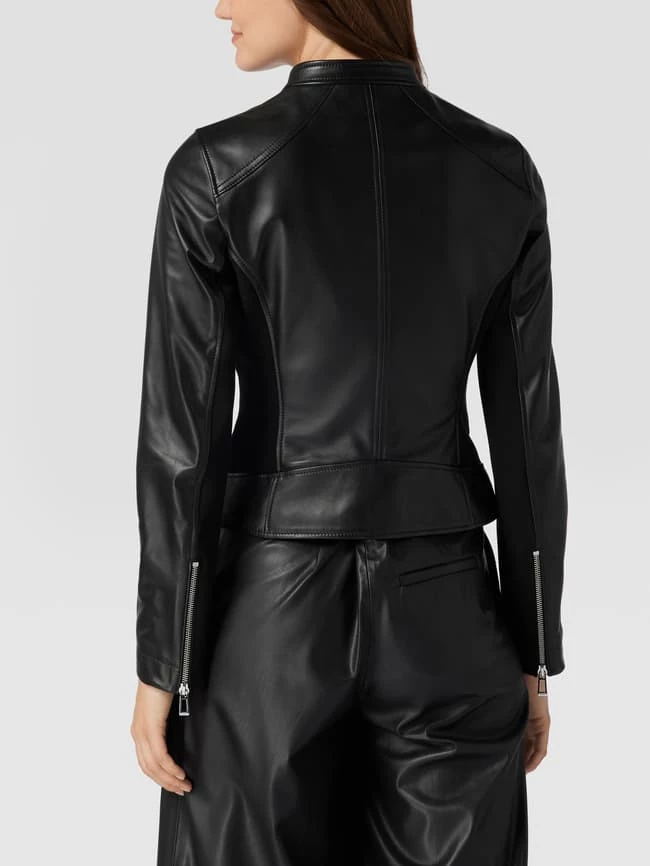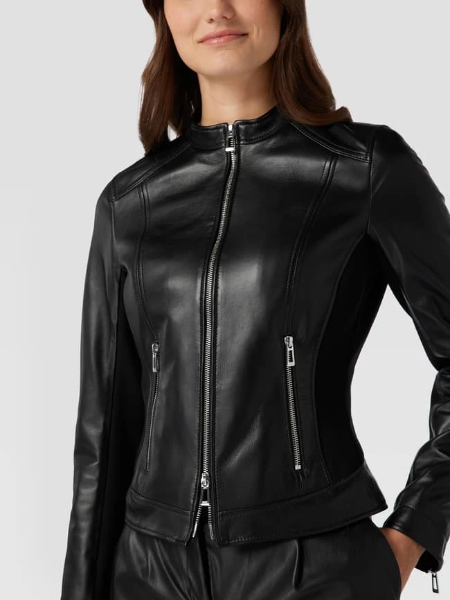 Die Lederjacke von HUGO ist aus echtem Lammleder gefertigt und tailliert geschnitten. Sie zeigt sich mit seitlichen Eingrifftaschen mit Reißverschluss und Stehkragen.